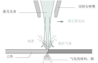 利用高功率密度激光束照射被切割材料,材料很快被加熱至汽化溫度,蒸發(fā)形成孔洞,隨著光束對(duì)材料的移動(dòng),孔洞連續(xù)形成寬度很窄的切縫,完成對(duì)材料的切割。